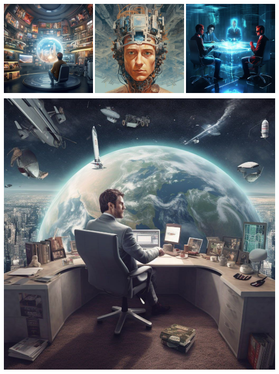 Впечатляющее умение искусственного интеллекта — он создает крутые визуалы к абсолютной любой идее за пару минут. Эту опцию облюбовал каждый пиарщик, и мы не исключение. С помощью ИИ мы визуализировали, как россияне представляют бизнес через 20 лет: переговоры с голограммами, знания в чипах, реклама в космосе. Фотокарточки из будущего в карусели.